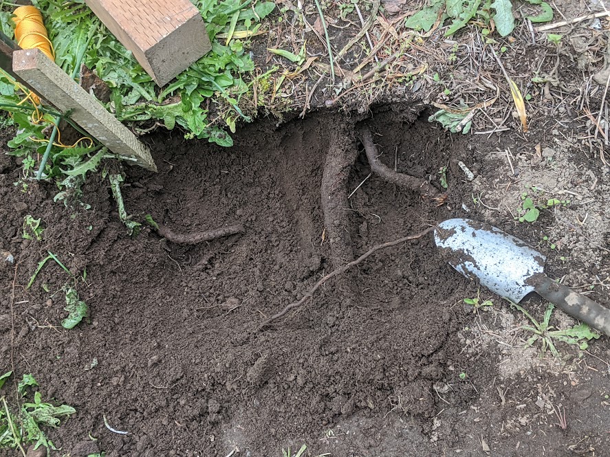 The site is fairly level, which is good. And it's very fertile, which is bad, for digging holes anyhow. I pulled up so many roots. I took out a fig tree and a little cedar (the cedar has been transplanted, posted elsewhere). I severely trimmed a pretty red rhodedendron right back to the edge of the porch. And so many blackberry vines and roots, etc etc. It was pretty rainy during this time and the ground was always soft but messy.