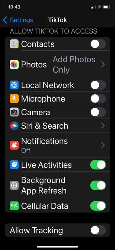 on my iPhone, I can select "off" from the "Allow Tracking" option for any mobile application. Apple gives its users this power. The screenshot below shows my settings for the mobile TikTok app on my phone. How are cookies tracking me if I have this turned off? TikTok knows my identity and what I do within the app. But I figure my identity is already in the white pages. It's already available. And who cares if I'm watching videos from "Steve the Guardrail guy?"