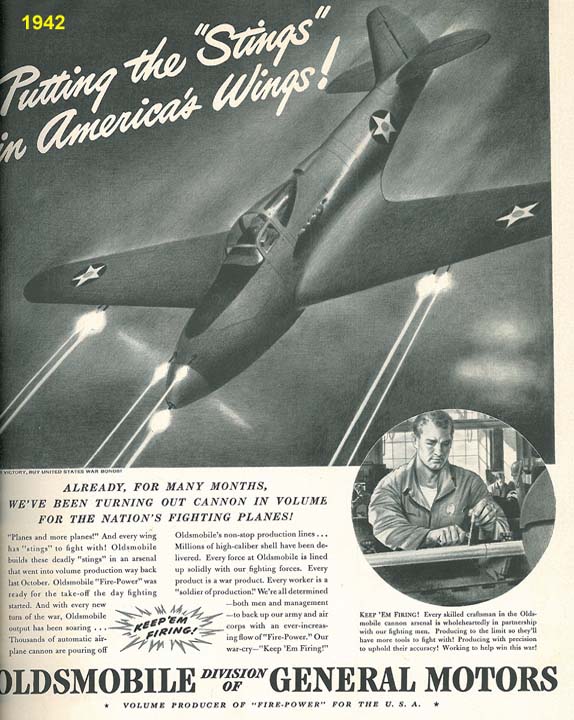 What they did not say. That Oldsmobile gun was used on P-39s. In 1942, it had many failures (ie jamming). P-39 was then made with other guns. Don't know if they stopped using Oldsmobile guns. Of course the ad fails to report a big problem as WWII began.