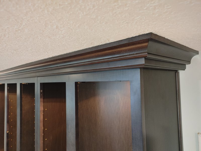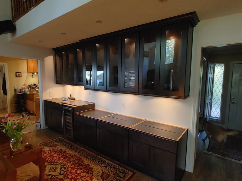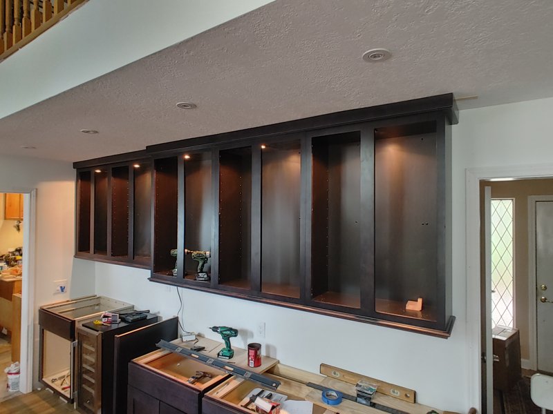 Not sure if I am loading images correctly, seems like a multi step task! Over the weekend we put on the glass front doors, finished the crown molding and yesterday I installed the under cabinet lighting.
