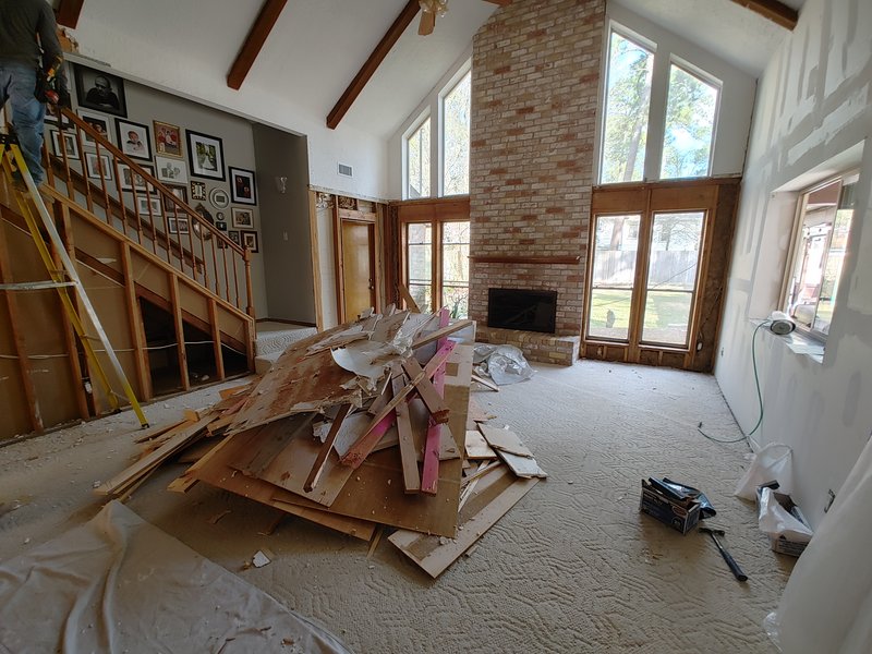 We did a big renovation on our family room. We started with gutting the ole paneled walls and removing the wall to wall carpet that was 20 years old and pretty disgusting. We hired a contractor to do most of the renovations. We went with smooth drywall for the walls painted white. We had these nasty dark faux cedar beams in the faulted ceiling. I had the contractor cover them with smooth wood and paint white. We did tile that looks like a planked wood floor; I had a tile company do that as my knees just don't do tile work anymore.