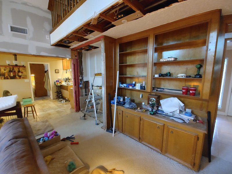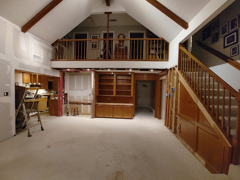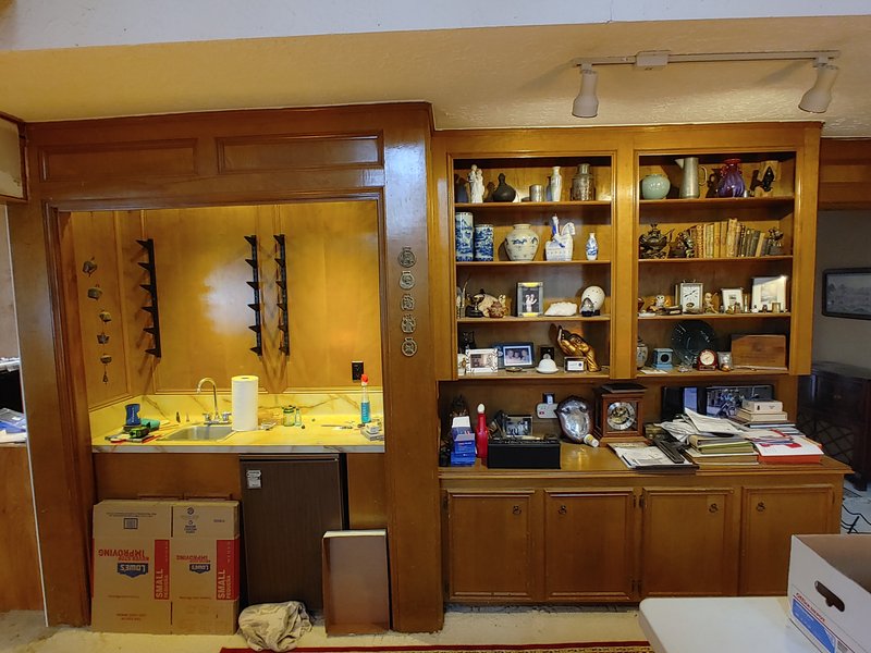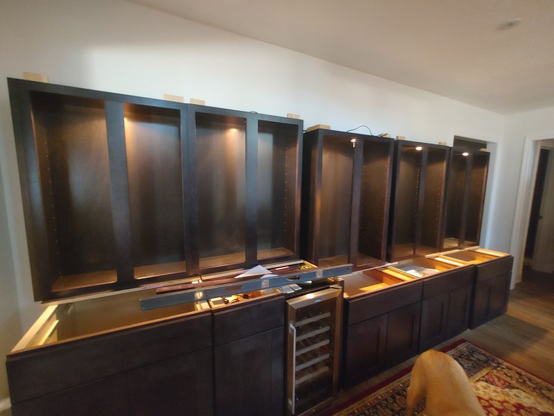 We had a wet bar/cabinet/book shelf area on one wall and we gutted that as well. We went with semi-custom cabinets from Kraftmaid. My wife wanted something more contemporary so we chose a dark/almost black stain over maple in a Shaker style. We got glass shelves and glass front doors, hopefully might control dust a bit more than open shelves. The bar area is to the left and will have a small bar sink. We are going to pick out granite counters and back splash this week.